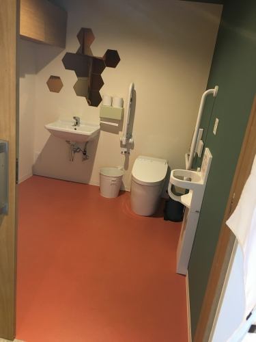 ベビーカーや車いすも入れる共同トイレございます。車いすの方も安心してお越しください。店内はすべてバリアフリーとなっております。