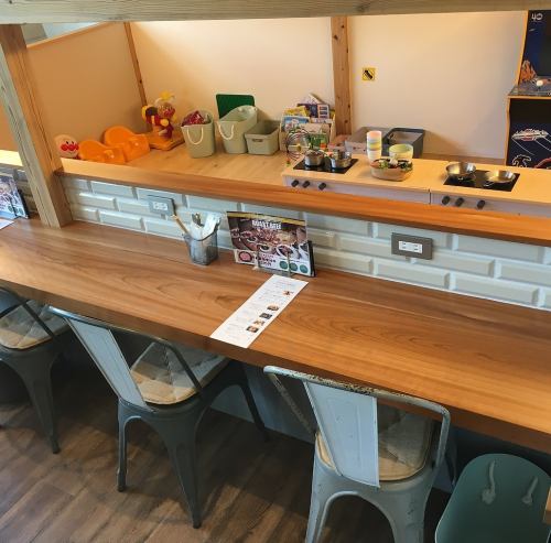 キッズスペースを眺めながらお食事頂けるカウンター席もございます。目が離せない年頃のお子様をお連れのお客様にオススメです。